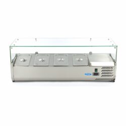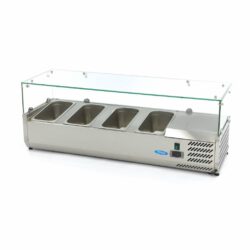 Pultová přípravná chladnička je ideální pro každodenní intenzivní používání v každé profesionální kuchyni. Lze do ní umístit čtyři nádoby GN o velikosti 1/3, které pomáhají udržovat ingredience při správné teplotě a připravené k okamžitému použití. Pultová přípravná chladnička se dobře hodí pro úkoly, jako je rychlé plnění připravovaných sendvičů, přidávání polev na pizzu nebo příprava salátů. Nádoby GN a víka nejsou součástí dodávky, ale lze je objednat samostatně prostřednictvím našich webových stránek.