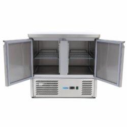 Kvalitní chladicí zařízení jsou v profesionální kuchyni nezbytností. Jakékoli potraviny, které nejsou konzervované nebo balené, vydrží déle čerstvé a zachovají si svou kvalitu, pokud je někde chladíte, například v kvalitní pultové chladničce. Výhodou je, že nejenže máte k dispozici kvalitní chladicí systém, ale také využijete funkční pracovní plochu s nerezovou deskou, která je ideální pro přípravu čerstvých surovin. Tento chladicí systém s ventilátorem má objem 179 litrů a za každými ze dvou robustních dveří z nerezové oceli se nachází nastavitelná police, takže si můžete přizpůsobit uspořádání.