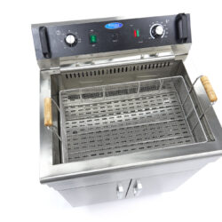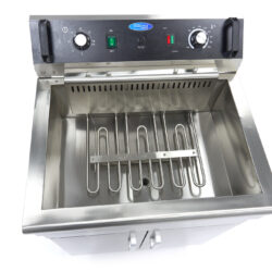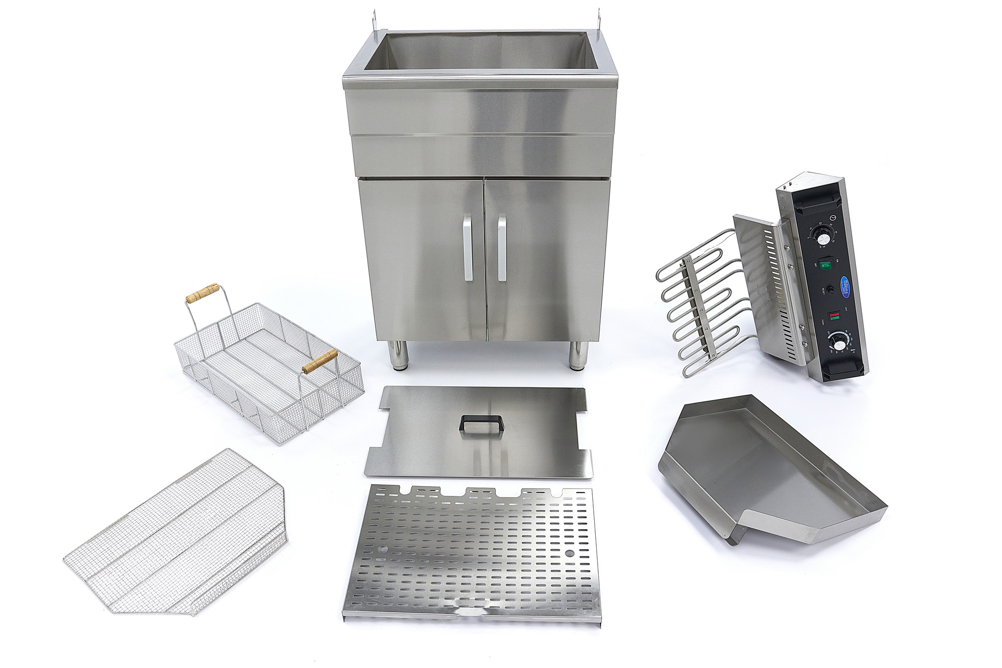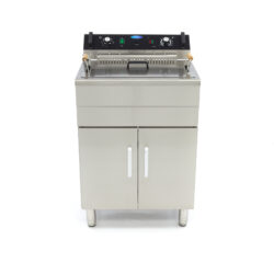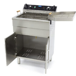 Fritéza, která se montuje na podstavec se skříňkou, funguje na 400V napájení. Spotřebič je navíc pro větší bezpečnost vybaven ochranou proti přetížení. Díky studené zóně můžete navíc fritovací olej používat déle. Topné těleso je zavěšeno mírně nad dnem fritézy. Veškerý olej mezi topným tělesem a dnem zůstává mírně chladnější. Tímto způsobem se propadlé drobky nepřipalují tak rychle a olej zůstává déle kvalitní. Teplotu v elektrické fritéze lze nastavit v rozmezí 50 °C až 200 °C a její součástí je praktický časovač.