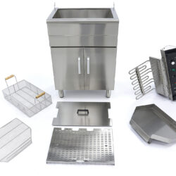 Fritéza a všechny její části, jako je sběrná mřížka, fritovací nádoba a fritovací koš, jsou vyrobeny z nerezové oceli, která se snadno čistí. Všechny části této luxusně zpracované fritézy se zaoblenými rohy jsou vyjímatelné. Zbytky oleje a tuku lze odstranit namočením dílů do teplé mýdlové vody. Vše jemně vydrhněte kartáčem a nakonec vše otřete do sucha měkkým hadříkem.