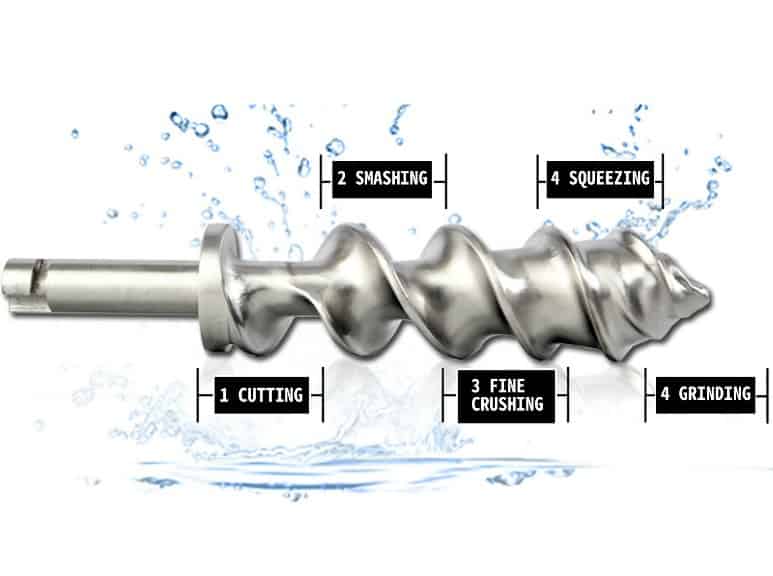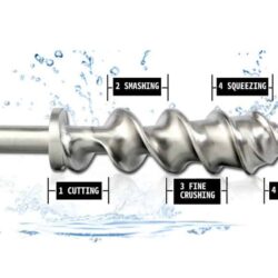- K úplnému lisování ingrediencí a zachování živin se používá extra dlouhá šneková hřídel s pětistupňovou technologií progresivního vytlačování.