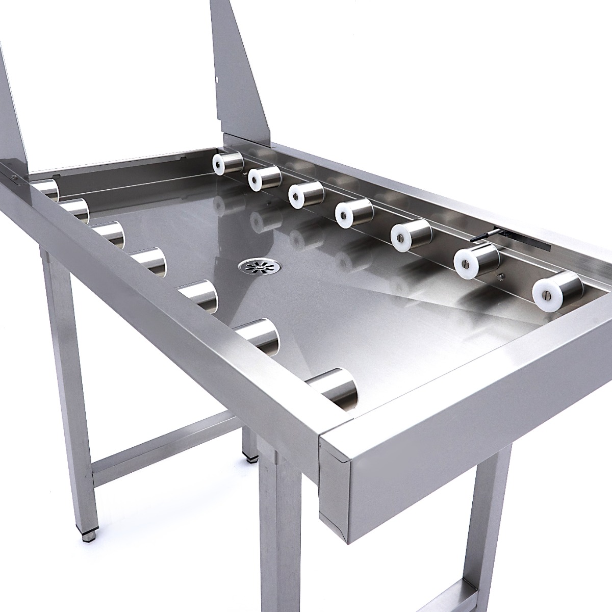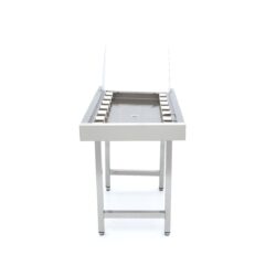 Rozměry tohoto válečkového stolu jsou š110 x h63 x v87,5 cm a je vyroben tak, aby se vešel do myčky s regálovým dopravníkem.