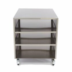 Strojní stolek je vyroben z nerezové oceli a velmi snadno se čistí. Základna je vybavena čtyřmi stabilními otočnými kolečky. Dvě z koleček mají brzdu, takže stojan zůstává stabilní a pevný. Stůl má nosnost 120 kg a váží 35 kg. Protože ne všechny kuchyňské spotřebiče mají vhodnou a stabilní základnu, je vždy užitečné objednat odpovídající stolek pro spotřebiče. Zadní část tohoto stolku je otevřená.