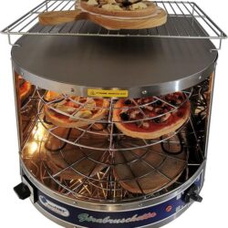Dvě police se otáčejí a přepínač volí použití jedné nebo obou pro zapékání v závislosti na množství, které má být připraveno.